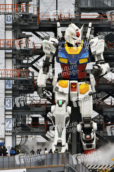 Der 19 Meter großer Modell-Roboter RX-78-2 Gundam aus der Animationsserie 'Kido Senshi Gundam / Mobile Suit Gundam' bei der Eröffnung der Gundam Factory Yokohama am Yamashita Pier. Der Roboter im Originalmaßstab kann insgesamt 24 Gelenke bewegen. Jede halbe Stunde nimmt er eine andere Pose ein und abends wird er beleuchtet. Yokohama, 19.12.2020