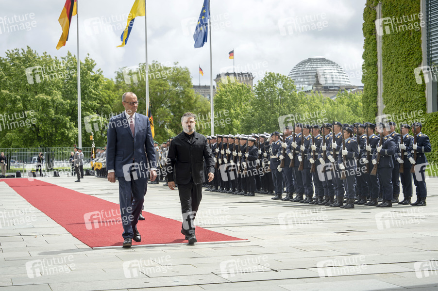 Friedrich Merz und Wolodymyr Selenskyj beim Empfang des Präsidenten der Ukraine mit militärischen Ehren und zu einem gemeinsamen Gespräch mit anschließendem Pressestatement im Bundeskanzleramt. Berlin, 28.05.2025