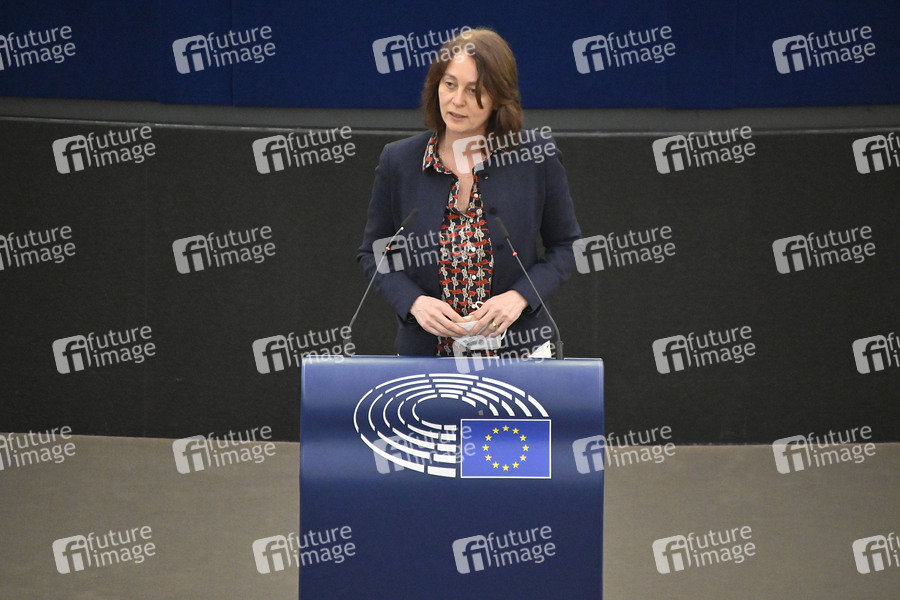Katarina Barley bei einer Plenartagung zur Zusammenarbeit und Gemeinsamkeiten des Putin-Regimes und rechtsextremer sowie separatistischer Bewegungen in Europa im Plenarsaal des Europäischen Parlaments. Straßburg, 06.04.2022