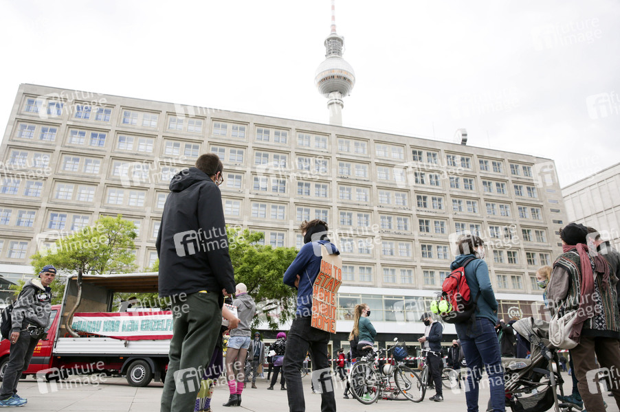 Auf dem Alexanderplatz haben sich einige Demonstranten versammelt, um gegen Verschwörungstheoretiker zu demonstrieren. Die Polizei hat den Platz abgeriegelt und kontroliert jeden, der ihn betreten will. Am Samstag sind rund um den Rosa-Luxemburg-Platz mehrere 'Hygienedemos' und Gegenproteste geplant. Am Alexanderplatz sollen ab 14 Uhr insgesamt zehn Kundgebungen starten. Berlin, 16.05.2020