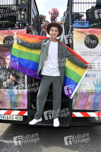 Maximillian Seitz auf dem JFMS Truck von Julian F. M. Stoeckel bei der 44. Christopher Street Day Parade 2022 unter dem Motto 'United in Love! Gegen Hass, Krieg und Diskriminierung' vom Spittelmarkt auf gut sieben Kilometern über Potsdamer Platz und Potsdamer Straße zum Nollendorfplatz, von dort weiter zur Siegessäule und zum Brandenburger Tor. Berlin, 23.07.2022