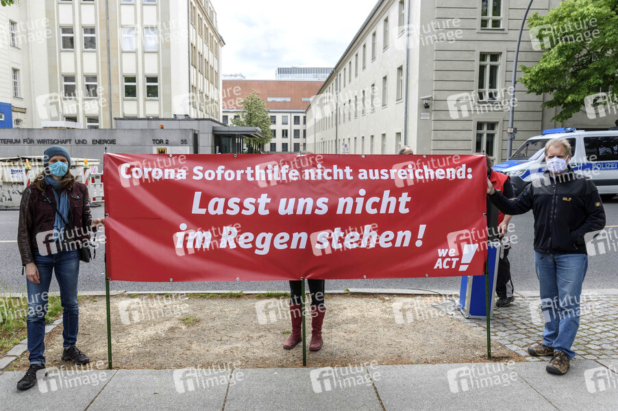 Gemeinsam mit Campact demonstrieren Solo-Selbstständige, Freiberufler und Künstler vor dem Bundeswirtschaftsministerium in Berlin gegen die 'Löcher' im Rettungsschirm. Mit einer Unterschriftenaktion fordern sie die Aufstockung der Hilfsgelder und die Möglichkeit, die Soforthilfen auch für den Lebensunterhalt verwenden zu dürfen. Berlin, 14.05.2020