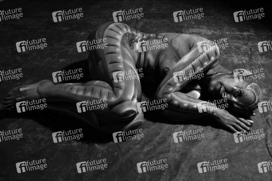 Bodypainting, Erotik, Frau, nackt, drinnen, weiblich, Monster, Außerirdische, Alien, Echse, Körperkunst, Kunst, Malerei, monochrom, erotic, woman, nude, indoor, female, monochrome, lizard, body art, body painting