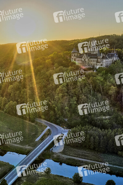 Sonnenuntergang am Schloss Marienburg auf dem Marienberg (Eine schriftliche Freigabe der Luftbilder durch die Pressesprecherin Annette Langhorst liegt vor). Nordstemmen, 13.08.2022