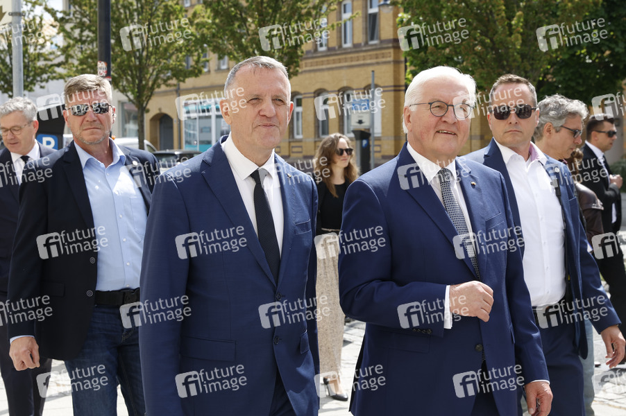 Frank-Walter Steinmeier mit Bürgermeister Manfred Wilde auf dem Weg durch die Stadt Delitzsch zum Rathaus. Steinmeier verlegt seinen Amtssitz für drei Tage nach Sachsen. Der Besuch im Landkreis Nordsachsen ist Teil der Reihe 'Ortszeit Deutschland', bei der das Staatsoberhaupt regelmäßig in verschiedene Regionen reist, um mit Bürgerinnen und Bürgern ins Gespräch zu kommen und die Entwicklung vor Ort kennenzulernen. Delitzsch, 20.05.2025