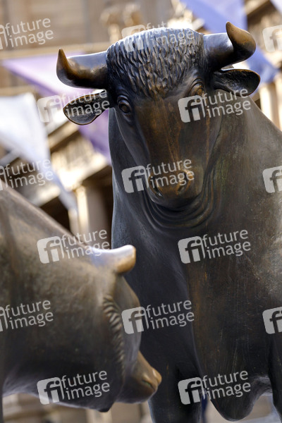 Bulle und Bär vor der Frankfurter Wertpapierbörse, wo es am Montag zu einem extremen Kurssturz kam. Bullenmarkt oder Hausse steht an der Börse für anhaltend steigende Kurse und Bärenmarkt oder Baisse für anhaltend sinkende Kurse. Frankfurt, 09.03.2020
