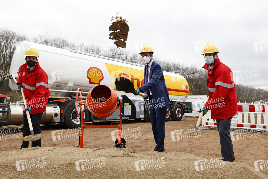 Geschäftsführer von Shell Deutschland, Manager, General Manager, Manager des Energy und Chemicals Park Rheinland, Politiker, CDU, Union, Ministerpräsident des Landes Nordrhein-Westfalen, NRW-Ministerpräsident, Auftritt, Shell, Industrie, Raffinerie, Royal Dutch Shell, Produktionsanlage, Gaskonzern, Gasindustrie, Ölindustrie, Ölkonzern, Treibstoff, Klimaziele, Förderung, Energiewende, Chemieindustrie, Kohlendioxid-Ausstoß, Gas, Erneuerbare Energien, Umweltschutz, Energietechnik, Umweltpolitik, Gaspreis, Gaspreise, Industriepolitik, Energiepolitik, Shell Energy, Chemicals Park Rheinland, CO2-neutral, Nachhaltigkeit, CO2-Neutralität, Biogas, Bio-Gas, Bio-LNG, flüssiges Gas, Biomethan, Methangas, Methan-Gas, Baustelle, Spatenstich, Helm
