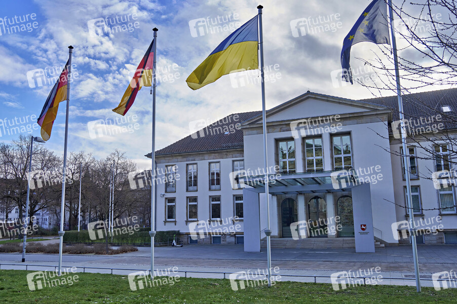 Niedersächsische Staatskanzlei - Beflaggung öffentlicher Landesgebäude mit den Flaggen der Bundesrepublik Deutschland, des Landes Niederschsen und der Ukraine zum 2.Jahrestages des Kriegsbeginn der russichen Streitkräfte gegen die Ukraine. Die Beflaggung stellt keine Tauerbeflaggung dar. Hannover, 24.02.2024