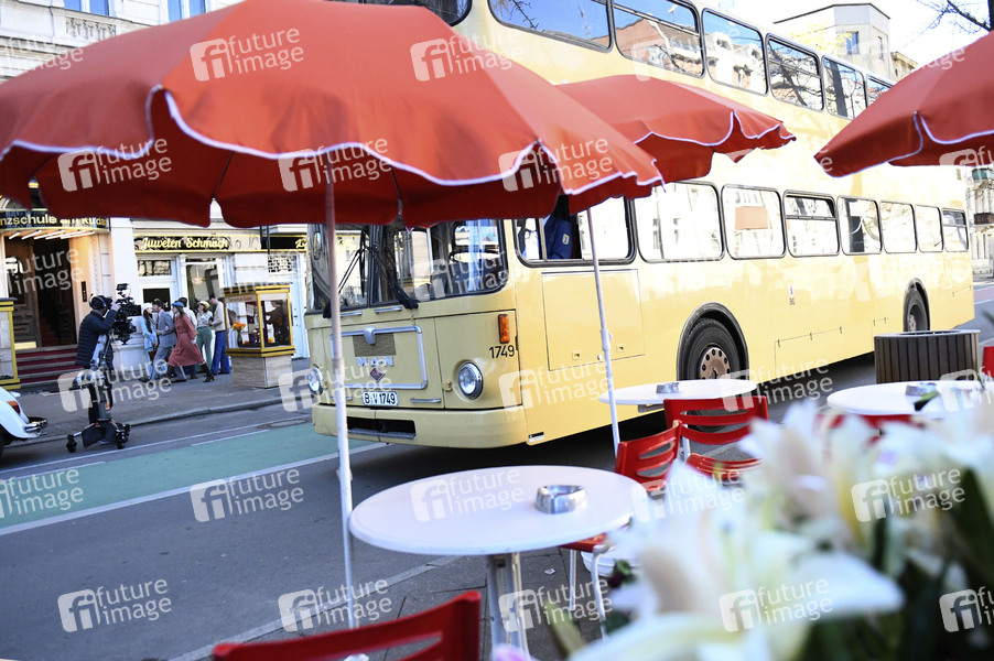Historischer Bus beim Fototermin am Set der ZDF Serie 'Ku'damm 77' in der Richard-Wagner-Straße. Berlin, 28.03.2025