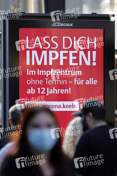 Die Stadt Köln wirbt auf Plakattafeln für ihr Impfangebot. Bürger ab 12 Jahren können sich ohne Termin in einem der Impfzentren oder mobilen Impfstellen ohne Voranmeldung impfen lassen. Über die Risiken werden Impflinge in einem Blatt aufgeklärt. Kritiker halten diese Aufklärung allerdings für unzureichend, da Langzeitstudien fehlen. (Themenbild, Symbolbild) Köln, 18.09.2021