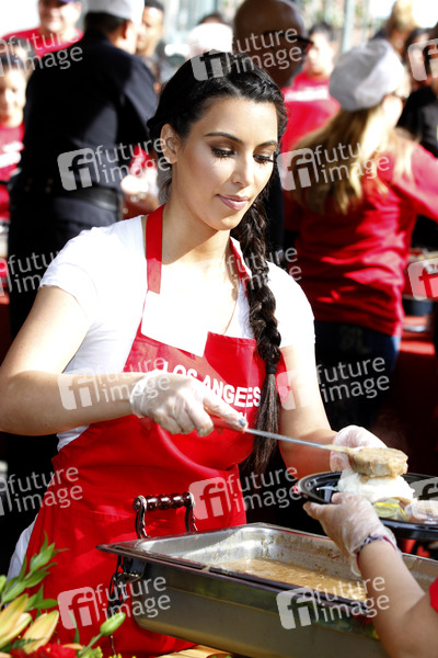 Prominente servieren Obdachlosen eine traditionelle Thanksgiving Mahlzeit zum 75. Geburtstag der Los Angeles Mission, Los Angeles, Kalifornien