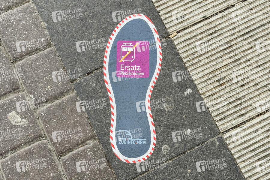 Im Rahmen von Streckenmodernisierungen oder Störungen des Eisenbahnbetriebes, richtet die Bahn einen Schienen-Ersatzverkehr mit Bussen ein. Hierdurch verlängert sich die Reisezeit oft erheblich zum Beispiel durch Verkehrsstaus auf den Straßen. Die Bushaltestellen zum Schienen-Ersatzverkehr werden in den Bahnhöfen durch auffällige Hinweisbanner und Schilder hingewiesen. (Symbolfoto, Themenfoto) Köln, 17.05.2025