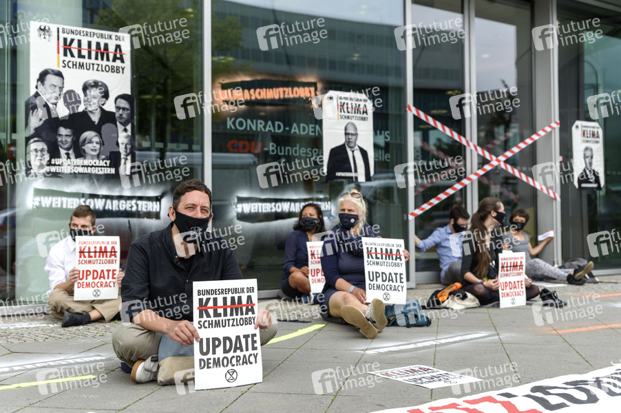 Umwelt-Aktivisten von Extinction Rebellion (XR) blockieren den Zugang zur CDU-Bundesgeschäftsstelle Konrad-Adenauer-Haus aus Protest gegen die klimaschädliche Politik der CDU. Vier Aktivisten haben sich an der Eingangstür zur Parteizentrale festgeklebt. Diese Aktion des zivilen Ungehorsams ist Teil der Aktionswoche gegen klimafeindliche Wirtschaftspolitik. Berlin, 18.06.2020