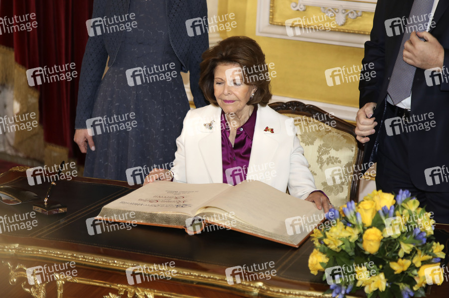 Königin Silvia von Schweden beim Eintrag ins Gästebuch anlässlich der Verleihung der Bayerischen Staatsmedaille für soziale Verdienste an Königin Silvia von Schweden in der Residenz. München, 17.12.2025
