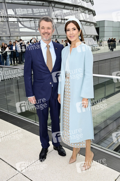König Frederik X. von Dänemark und Königin Mary von Dänemark beim Empfang des dänischen Königspaars durch Bundestagspräsidentin Bas vor der Kuppel auf der Dachterrasse des Reichstagsgebäudes. Berlin, 21.10.2024