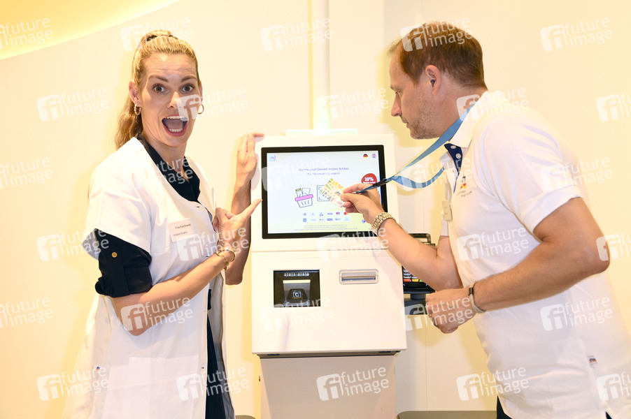 Rebecca Kunikowski und Tim Niedernolte bei der Charity-Aktion 'Kassieren für den guten Zweck' an der dm-Kasse in der Mall of Berlin. Berlin, 18.07.2025