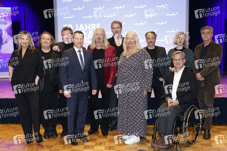 Kim Fisher, Martin Becker, Claudius Dreilich, Ralf Ludwig, Bernd Römer, Daniel Bätge, Jana Brandt, Heiko Jung, Olaf Jacobs, Uta Bretschneider und Lutz Pehnert bei der Preview der MDR-Dokumentation '50 Jahre Karat' im Zeitgeschichtlichen Forum. Leipzig, 25.03.2025