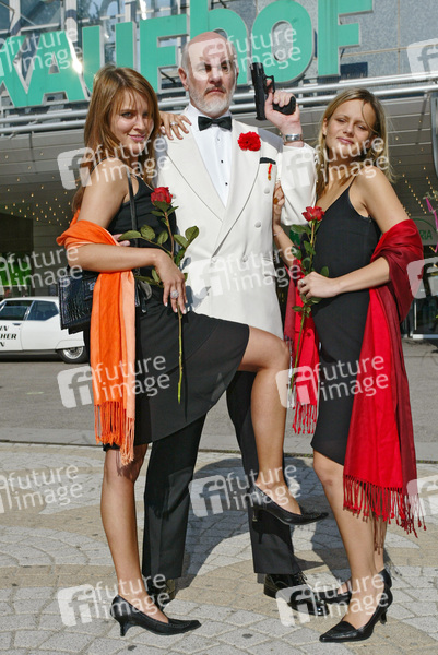 Der Schauspieler und Sean Connery-James Bond Doppelgänger Nick Richmond posiert mit zwei Begleiterinnen vor dem Kaufhof anlaesslich eine Werbe-Aktion von Gerry Weber in Berlin