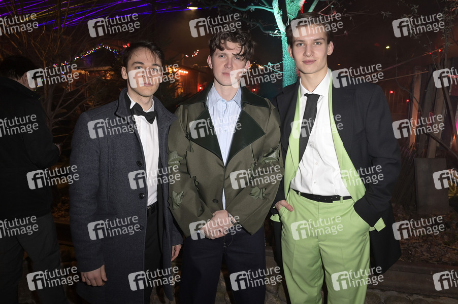 Fabian Hanis, Lennart Betzgen und Gast bei der Medienboard Party 2024 im Rahmen der Berlinale 2024 am Holzmarkt. Berlin, 17.02.2024