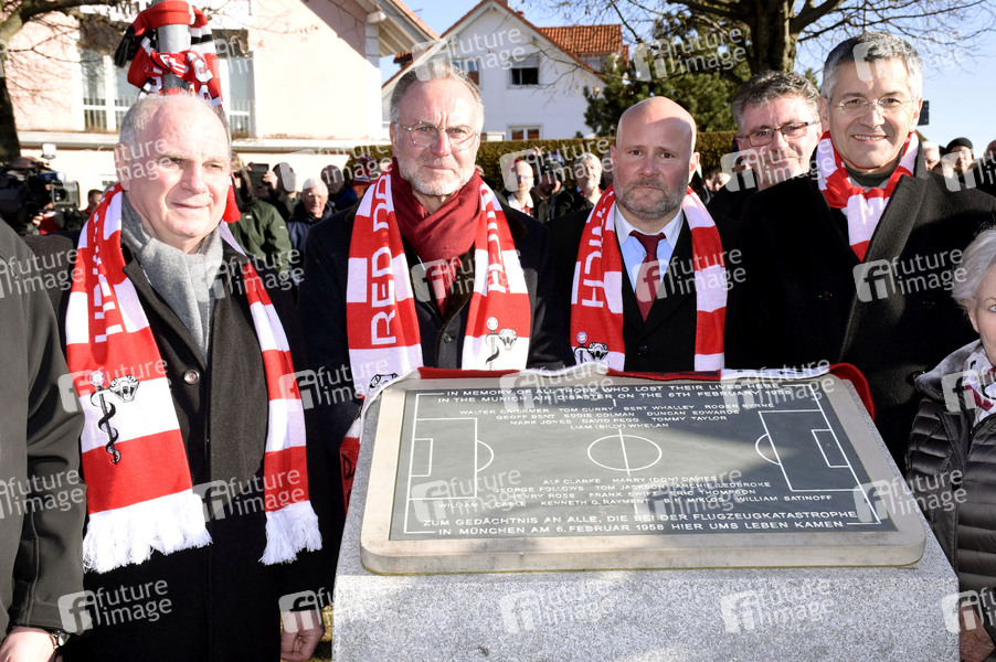 Uli Hoeneß, Karl-Heinz Rummenigge, Christian Vorländer und Herbert Haimer bei der Grundsteinlegung für eine Gedenkvitrine zum 62. Jahrestag des Flugzeugunglücks am damaligen Flughafen München-Riem, bei dem 23 Menschen ums Leben kamen, darunter acht Fußballspieler von Manchester United, am Manchesterplatz. München, 06.02.2020