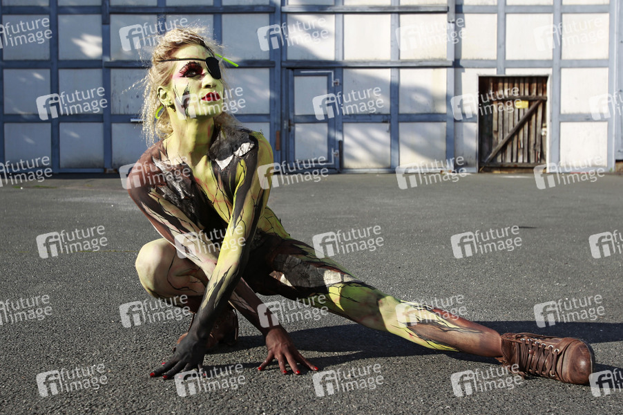 Bodypainting, Erotik, Frau, Mädchen, nackt, draußen, weiblich, Körperkunst, Kunst, Malerei, Augenklappe, erotic, woman, girl, nude, outdoor, female, body art, body painting, eyepatch