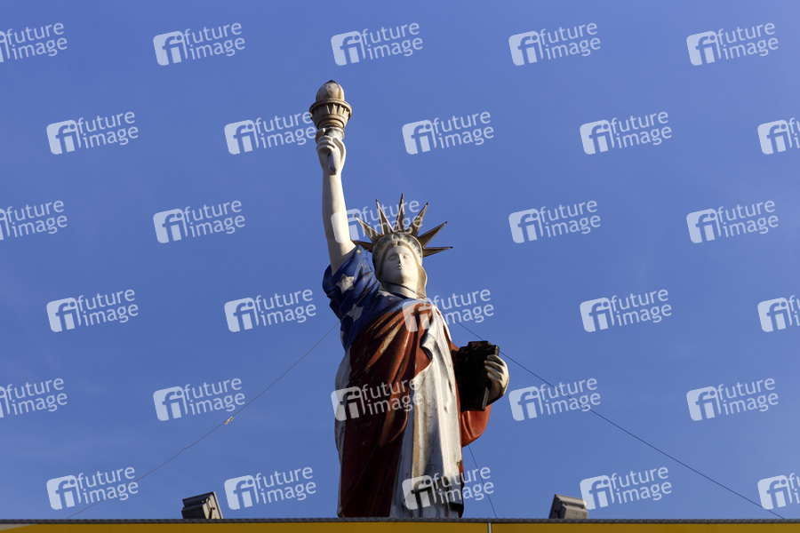 Statue of Liberty, Lady Liberty, Model, Amerikanismus, US-Kultur, us-amerikanisch, Skulptur, Neoklassizismus, neoklassizistisch, Libertas, römische Göttin der Freiheit, Wahrzeichen, Demokratie, Freiheit, abendländische Kultur, Einheitskultur, Nachbau, Fackel, Leuchtfeuer, Tafel mit Datum der Unabhängigkeit, Declaration of Independence, Symbolbild, Symbolfoto