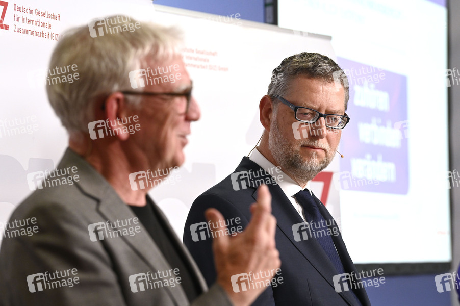 Jochen Flasbarth und Thorsten Schäfer-Gümbel bei der Jahrespressekonferenz 2024 der Deutschen Gesellschaft für internationale Zusammenarbeit GmbH im Tagungszentrum im Haus der Bundespressekonferenz. Berlin, 24.06.2024