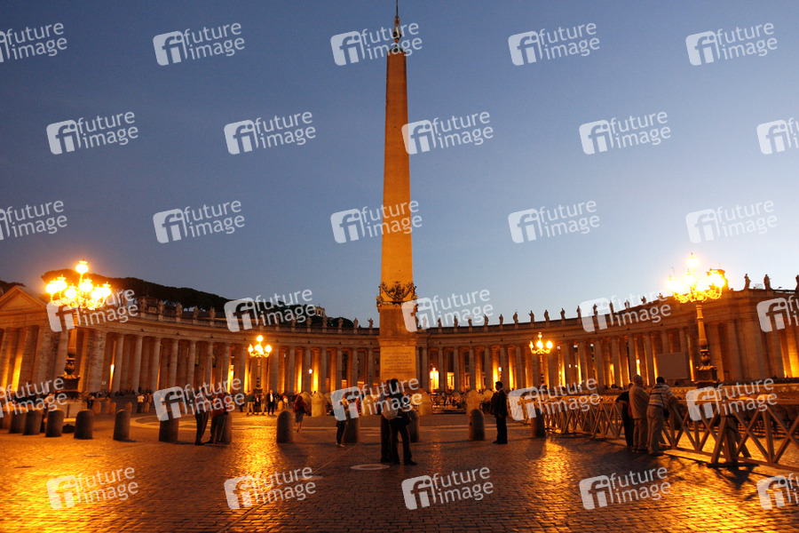 wurde von Gian Lorenzo Bernini zwischen 1656 und 1667 unter Papst Alexander VII. (1655–1667) vor dem Petersdom in Rom angelegt, der Petersplatz ist Teil des Territoriums der Vatikanstadt, die Kolonnaden bilden die Grenze zwischen Vatikanstadt und Italien, ca. 35.300 m² groß, Obelisk, Nachtaufnahme