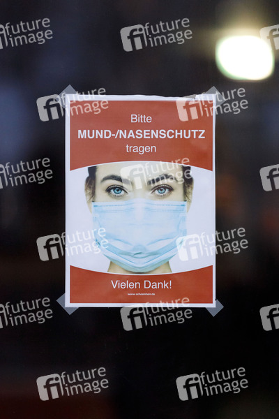 Wegen der Corona-Pandemie haben sich Bund und Länder auf eine Verlängerung des Lockdown bis Mitte Februar geeinigt. Somit bleiben beispielsweise Restaurants, Kulturbetriebe und viele Geschäfte im Einzelhandel geschlossen. In Geschäften und dem Nahverkehr besteht zudem ab Montag eine Pflicht zu medizinischen Masken (FFP2-Masken oder OP-Masken). Im Einzelhandel drohen zudem tausende Insolvenzen, weil vom Staat versprochene Finanzhilfen immer noch nicht rechtzeitig ankommen. Im Bild ein Hinweisschild, das Kunden zum Tragen einer Mund-Nasen-Bedeckung bittet an einem Laden in der Kölner Altstadt. (Themenbild, Symbolbild) Köln, 23.01.2021