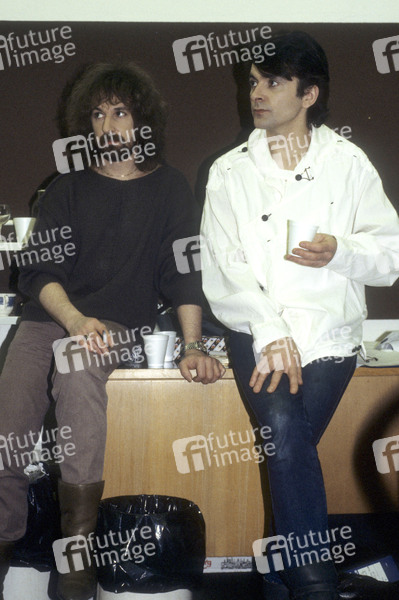 Les Holroyd und Woolly Wolstenholme von Barclay James Harvest bei den Dreharbeiten zum Musikvideo von 'Victims of Circumstance' in den Ewart Studios. London, 28.03.1984