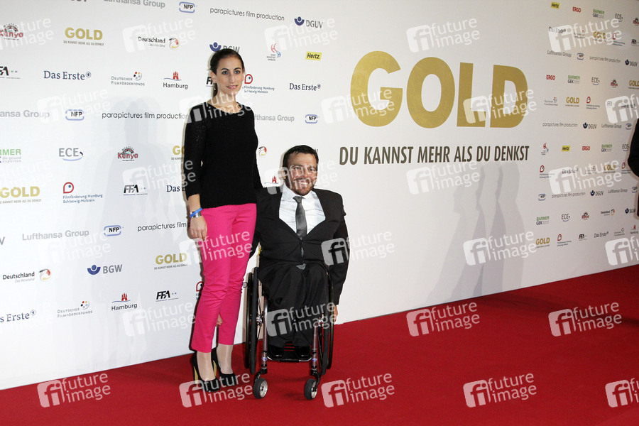 Kurt Fearnley mit Ehefrau Sheridan Fearnley bei der Premiere von 'Gold - Du kannst mehr als du denkst' im Hangar Nr. 6 der Lufthansa Technik. Hamburg, 26.02.2013
