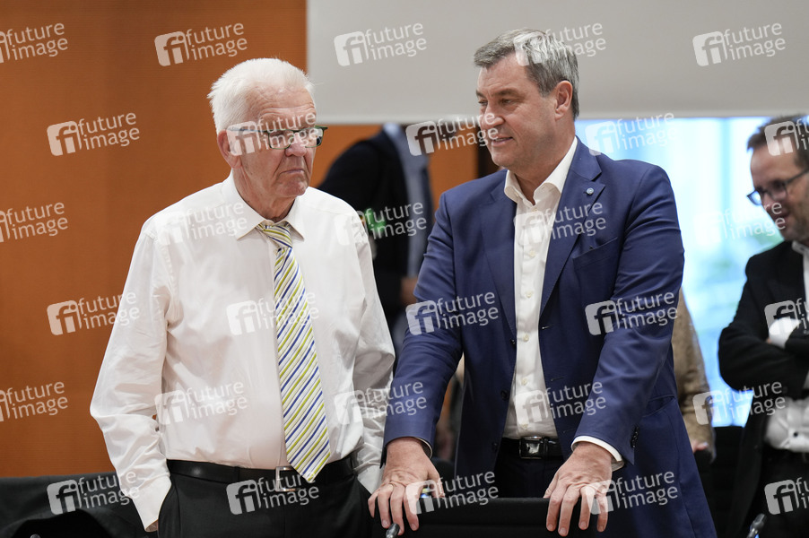 Winfried Kretschmann und Markus Söder bei der Besprechung von Bundeskanzler Scholz mit den Regierungschefinnen und Regierungschefs der Länder bei der Ministerpräsidentenkonferenz im Bundeskanzleramt. Berlin, 20.06.2024