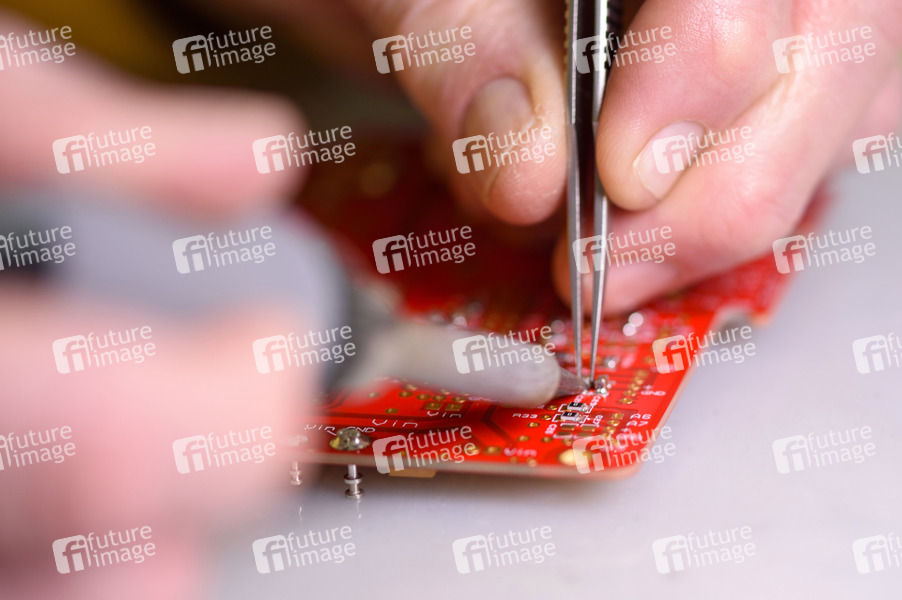 Eine Leiterplatte wird mit einem Lötkolben gelötet. (Themenbild, Symbolbild)