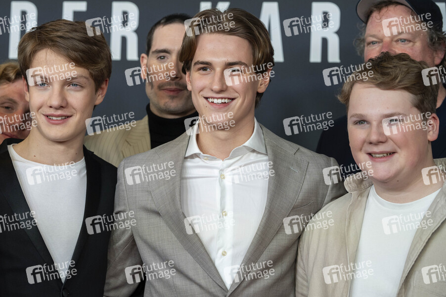 Levi Brandl, Nevio Wendt und Julius Weckauf bei der Weltpremiere des Kinofilms 'Die drei ??? und der Karpatenhund' im Mathäser Filmpalast. München, 12.01.2025