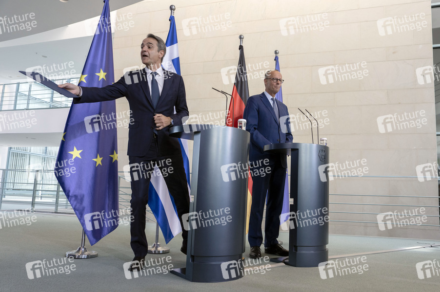 Kyriakos Mitsotakis und Friedrich Merz beim Empfang des Ministerpräsidenten von Griechenland mit militärischen Ehren mit anschließendem Pressestatement im Bundeskanzleramt. Berlin, 13.05.2025