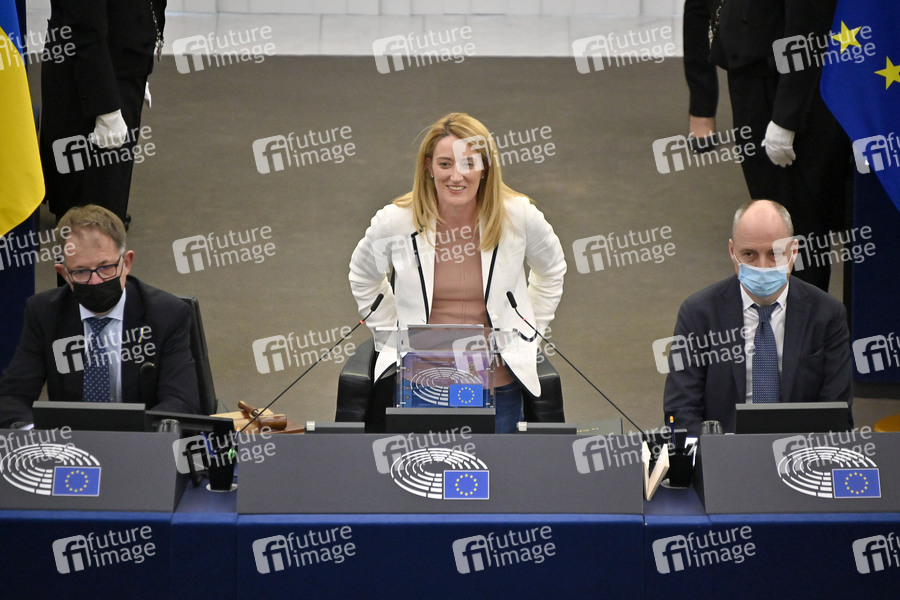 Parlamentspräsidentin Roberta Metsola bei einer Plenartagung im Plenarsaal des Europäischen Parlaments. Straßburg, 04.04.2022
