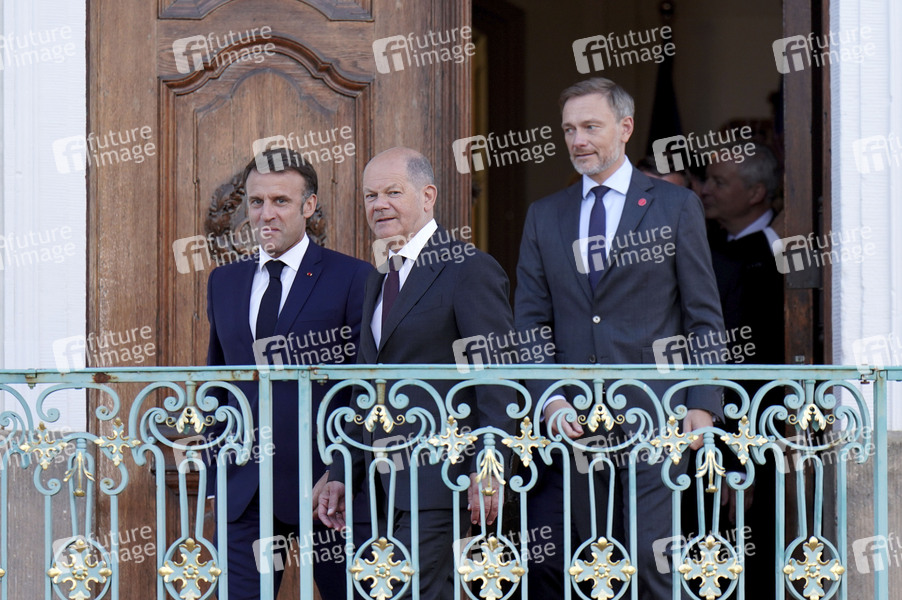 Emmanuel Macron, Olaf Scholz und Christian Lindner beim Treffen des Deutsch-Französischen Ministerrats im Gästehaus der Bundesregierung Schloss Meseberg. Meseberg, 28.05.2024