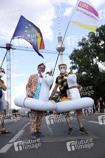 Protest für Gleichstellung: Tausende Demonstranten ziehen in Berlin unter dem Dach des Christopher Street Day zum Alexanderplatz. Wegen der Pandemie wurden die Teilnehmer auf drei Züge aufgeteilt, die sich für verschiedene politische Interessen einsetzten. Berlin, 26.06.2021