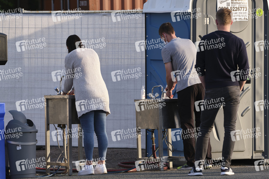 Die erste Autokultur-Veranstaltung 'Die Pochers hier' auf dem Schützenplatz. Die Besucher verfolgen unter Berücksichtigung klarer Hygiene-Vorschriften während der Corona-Krise den Auftritt aus dem Auto. Hannover, 07.05.2020