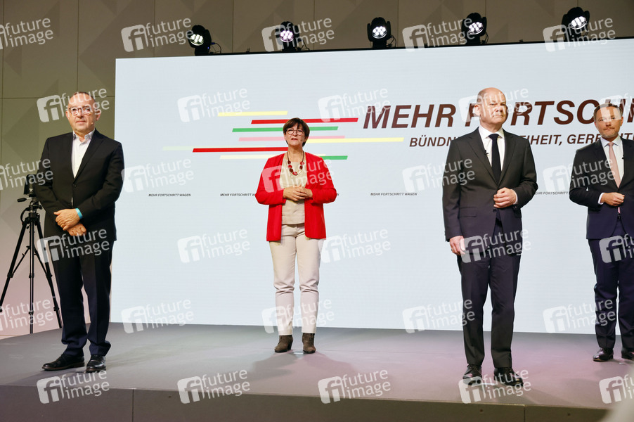 Norbert Walter-Borjans, Saskia Esken, Olaf Scholz und Christian Lindner beim Pressetermin zur Unterzeichnung des Koalitionsvertrages zwischen SPD, Bündnis 90/Die Grünen und FDP im Futurium. Berlin, 07.12.2021