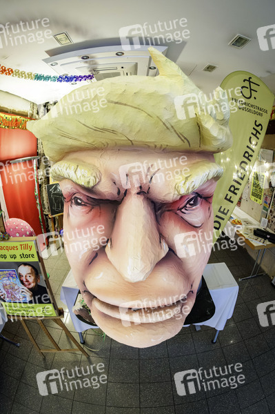 Hinter einem Schaufenster an der Friedrichstraße 67 können Passanten einen grimmig dreinblickenden Donald Trump entdecken. Die Figur stammt von einem Rosenmontagswagen und wurde von Künstler Jacques Tilly gestaltet. Die Friedrichstraße sorgte in Düsseldorf schon für einige negative Schlagzeilen. Die Initiative 'Die Friedrichs' macht auf die Folgen für Anwohner, den Verkehr und die Geschäftsleute durch jahrelange Baustellen aufmerksam. Düsseldorf, 02.02.2026