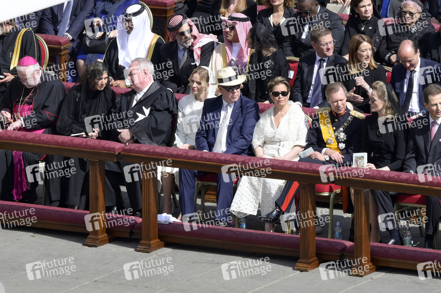 Fürst Albert II. von Monaco mit Ehefrau Charlene und Großherzog Henri von Luxemburg mit Ehefrau Großherzogin Maria Teresa von Luxemburg bei der Amtseinführung von Papst Leo XIV. auf dem Petersplatz. Vatikanstadt, 18.05.2025