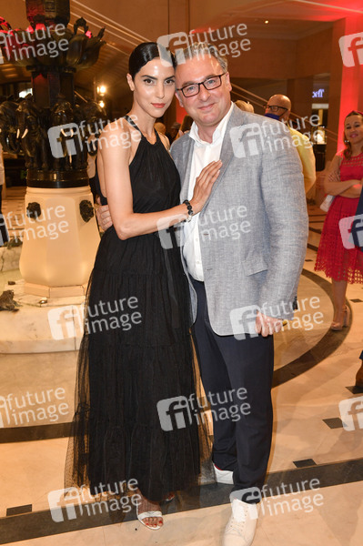 Zoe Helali mit Begleitung bei der Anja Gockel Fashionshow Summer 2021 'Asuka' im Hotel Adlon Kempinski. Berlin, 30.06.2020