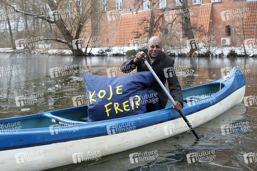 Yared Dibaba paddelt auf dem Schloßteich für die Aktion 'Koje frei?' um für Unterkünfte für Teinehmer der Kirchentags zu werben. Winsen an der Luhe, 13.03.2013