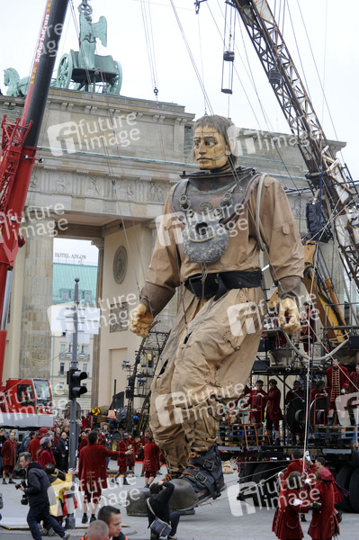 Riesen-Marionetten kommen zum Brandenburger Tor am Tag der Deutschen Einheit in Berlin
