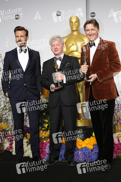 Jason Sudeikis mit Malcolm Clarke und Nicholas Reed mit Oscars für den besten Dokumentar-Kurzfim 'The Lady in Number 6' bei der Oscar Verleihung 2014 / 86th Academy Awards Preisverleihung im Dolby Theatre, Hollywood. Los Angeles, 02.03.2014