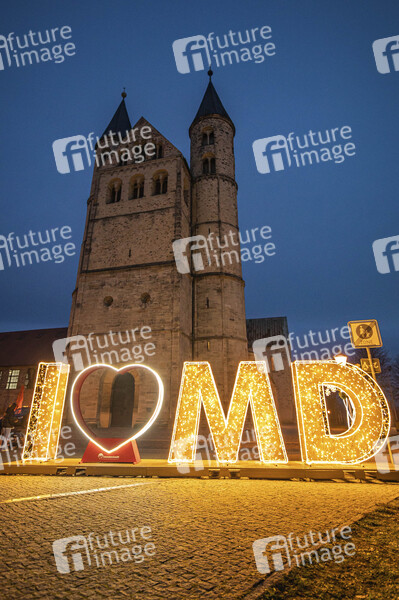 Lichterwelt vor dem Magdeburger Kloster Unser Lieben Frauen - Die Licherwelt Magdeburg mit der umfangreichste Weihnachts- und Winterbeleuchtung in Mitteldeutschland verteilt über die ganze Stadt. Magdeburg, 27.11.2022