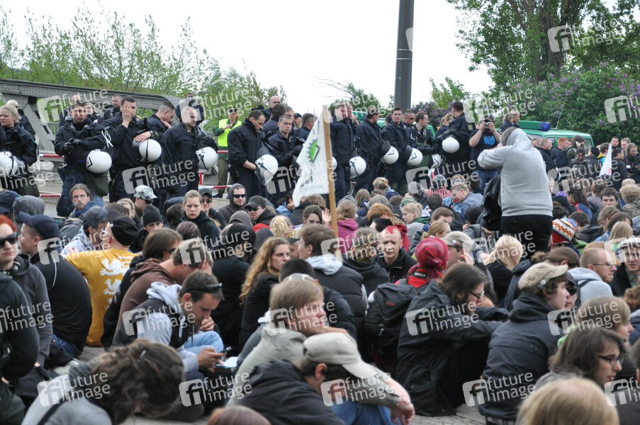 Demo, Demonstranten, Maidemonstration, Polizei, Polizisten, Polizist, Sitzblockade