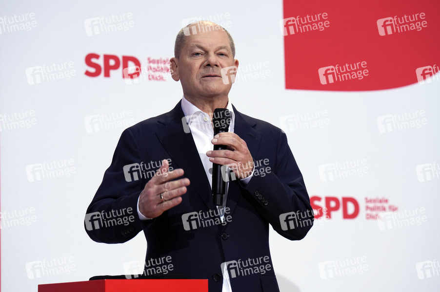 Olaf Scholz bei der Pressekonferenz der SPD nach den Gremiensitzungen zur Beratung aktueller Themen und der Nominierung des SPD-Kanzlerkandidaten für die Bundestagswahl im Atrium vom Willy-Brandt-Haus. Berlin, 25.11.2024