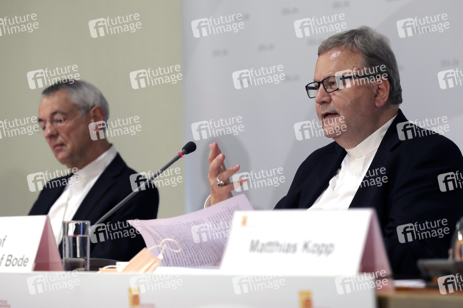 Dr. Ludwig Schick (Erzbischof von Bamberg, Vorsitzender der Kommission Weltkirche) und Dr. Franz-Josef Hermann Bode (stellvertretender Vorsitzender der Deutschen Bischofskonferenz, Bischof von Osnabrück, Vorsitzender Pastoralkommision) beim Pressegespräch zum Thema 'Corona - kirchliche Verantwortung und Anwaltschaft' am zweiten Tag der Herbst-Vollversammlung der Deutschen Bischofskonferenz im Dompfarrzentrum. Fulda, 23.09.2020